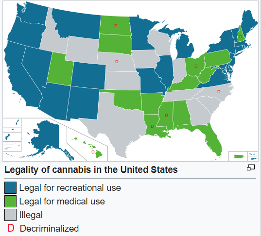 Amerika Serikat sebagai negara perserikatan memiliki dua sistem kebijakan hukum; yaitu hukum yang berkaitan dengan hal yang konstitusional (federal), ataupun hukum yang diregulasi oleh masing-masing negara bagian. Secara konstitusional, ganja masih digolong ilegal — sejak pemerintah memulai propaganda anti-ganja — tetapi setiap negara bagian AS memiliki regulasi legalisasi ganja-nya sendiri, dimana perbandingan saat ini lebih banyak negara bagian yang melegalisasi ganja; baik medis atau rekreasional, daripada yang ilegal.